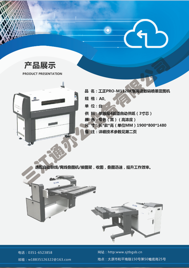 太原市三江通辦公設備有限公司是一家專業從事曬圖機、數碼復印機、多功能打印、復印、掃描、縮放一體機、模擬工程復印機、繪圖儀、大型掃描儀、電子歸檔設備、手動、自動成形圖紙檔案密集柜、圖前圖后設備以及所有制圖設備耗材供應、維修一條龍的實體企業。多年來,已與日本、北京、天津、上海、杭州等諸多家廠方多方合作,成為山西>>更多